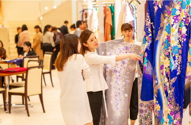 生地にこだわった衣裳をお得に選ぶことができるのも展示会の魅力。さらに結婚式に携わるドレススタイリストが振袖選びをサポート
